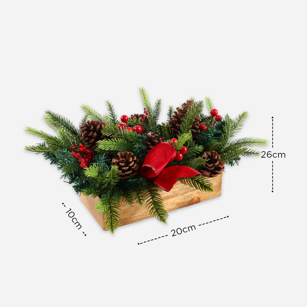 Add a touch of holiday accent to your table with this Christmas arrangements, perfect for festive displays. Material: Wood and Plastic Pre-decorated Makes a perfect statement piece Measurement: L20 x W10 x H26 cm