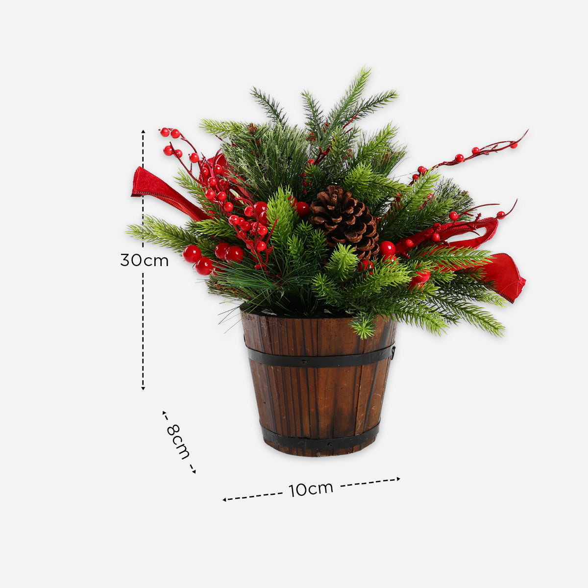 Add a touch of holiday accent to your table with this Christmas arrangements, perfect for festive displays. Material: Wood and Plastic Pre-decorated Makes a perfect statement piece Measurement: L10 x W8 x H30 cm